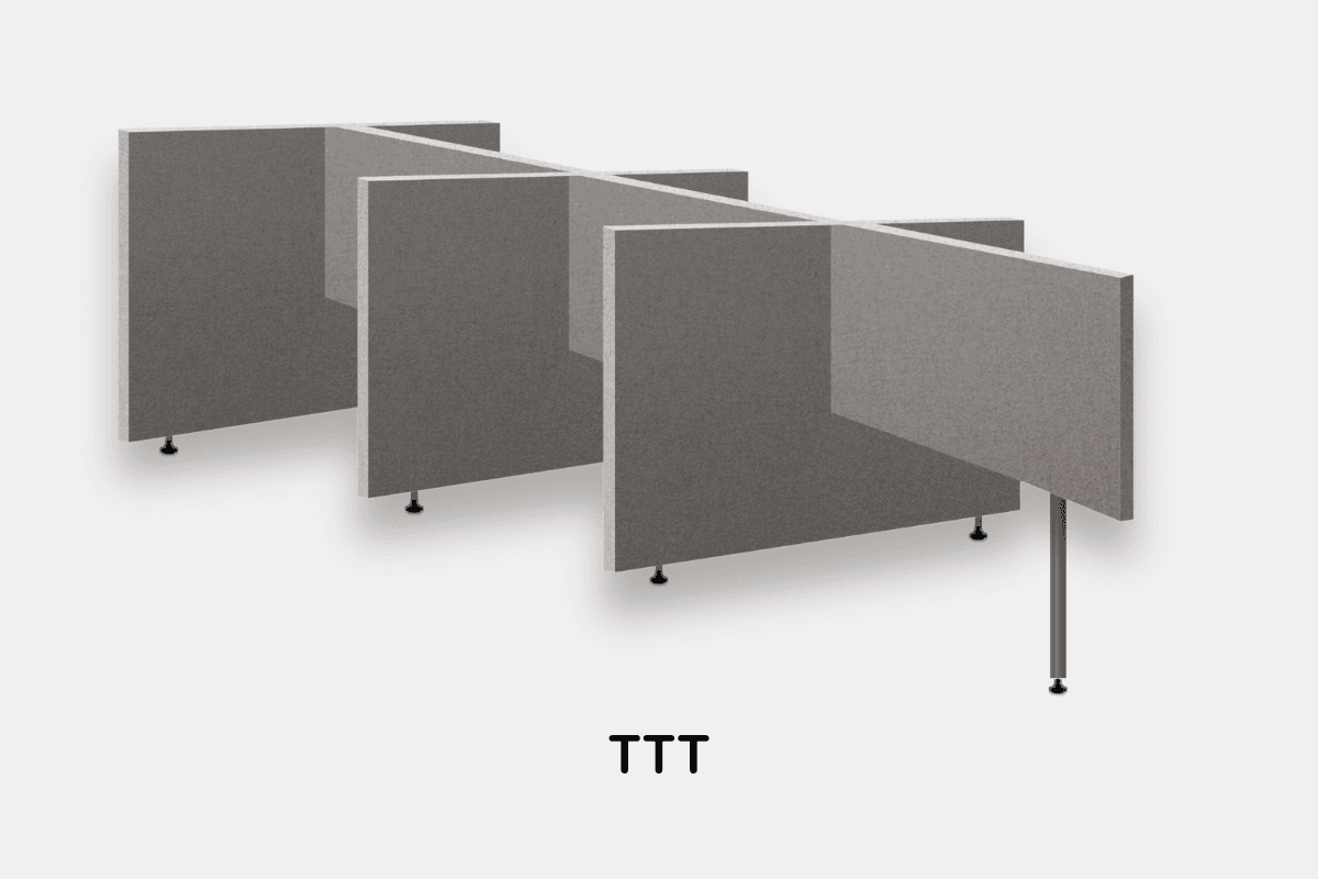 Naast deze TTT-opstelling, zijn er 4 andere standaardopstellingen in verschillende afmetingen verkrijgbaar. De schermen zijn gemaakt van 40 mm berken multiplex, gevuld met gerecycled katoen en afgewerkt met de duurzame stof MoVe. Hiermee is deze oplossing een milieuvriendelijke keus. De schermen hebben een standaarddikte van 58 mm. Bekijk alle 9 opstellingen.