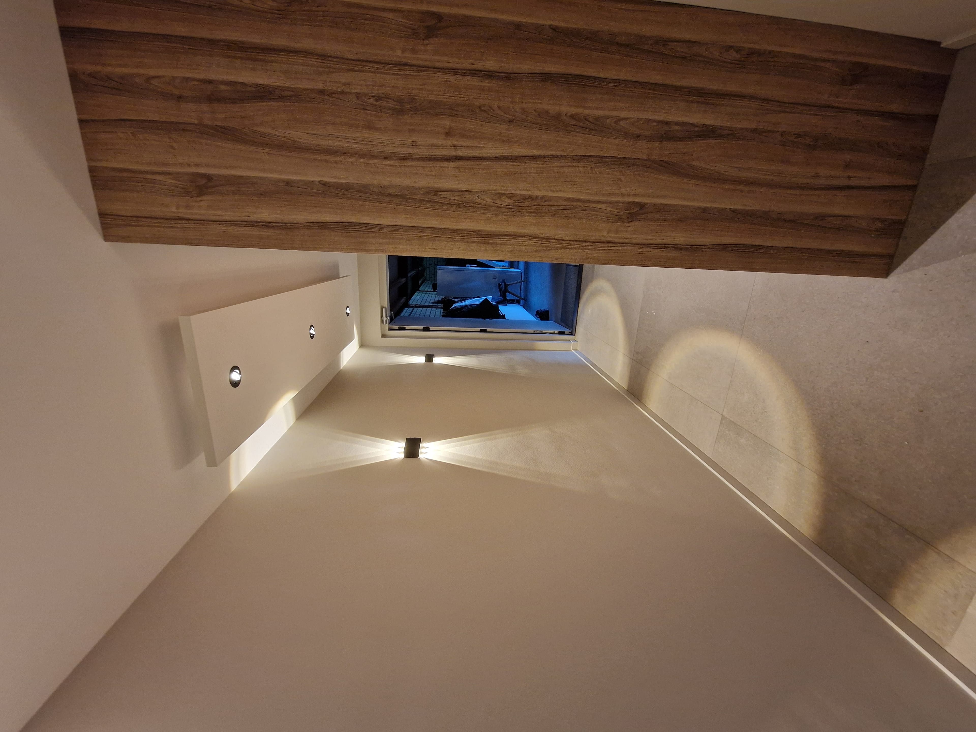 Omdat de ruimte smaller is, is maatwerk gewenst. Er is gekozen om twee verlijmbare plafondpanelen aan een ophangsysteem van onze kaderloze plafondeilanden te plaatsen. Bij de deur zijn de spotjes die in het plafond zaten teruggeplaatst in het plafondpaneel.